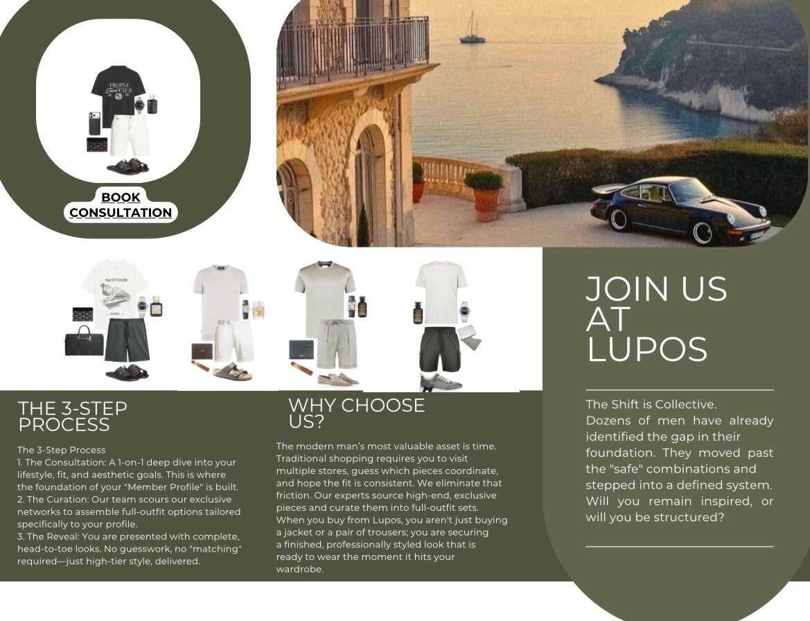 At Lupos LTD, we move beyond hourly personal shopping. Our value-based membership model focuses on delivering the end result: a cohesive, confidence-boosting wardrobe curated, sourced, and fitted specifically for you. Experience the 'Evolved Style' guarantee.